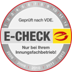 Hierbei handelt es sich um ein Gütesiegel, das ausschließlich von geprüften Innungsfachbetrieben des Elektrohandwerks vergeben werden darf. Der in regelmäßigen Abständen vorgenommene E-CHECK vermeidet hohe Reparaturrechnungen für die Elektroinstallation und den in Haushalt und Gewerbe verwendeten Maschinen und Geräten.